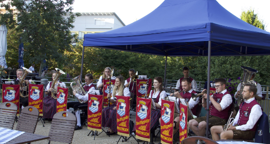 Am Mittwoch den 25.08.21 hat es endlich geklappt: Die böhmische Besetzung der Stadtkapelle spielte bei Kaiserwetter auf der Zusaminsel in Wertingen auf. Nachdem der erste Termin aufgrund des instabilen Wetters abgesagt werden musste, freuten sich die Musiker*innen der kleinen Besetzung umso mehr auf den Ersatztermin. Bei der „Südböhmischen Polka“ und dem „deutschen Regimentsmarsch“ glänzten die beiden Klarinettistinnen Franziska Mayr und Anna-Lena Neukirchner.